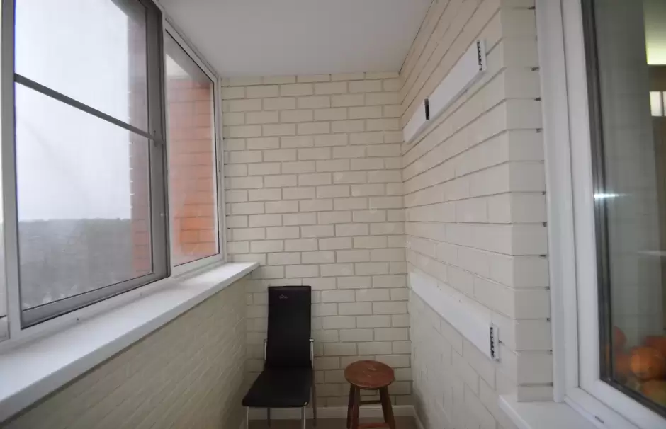Отделка балкона декоративным камнем, ламинат и натяжной потолок